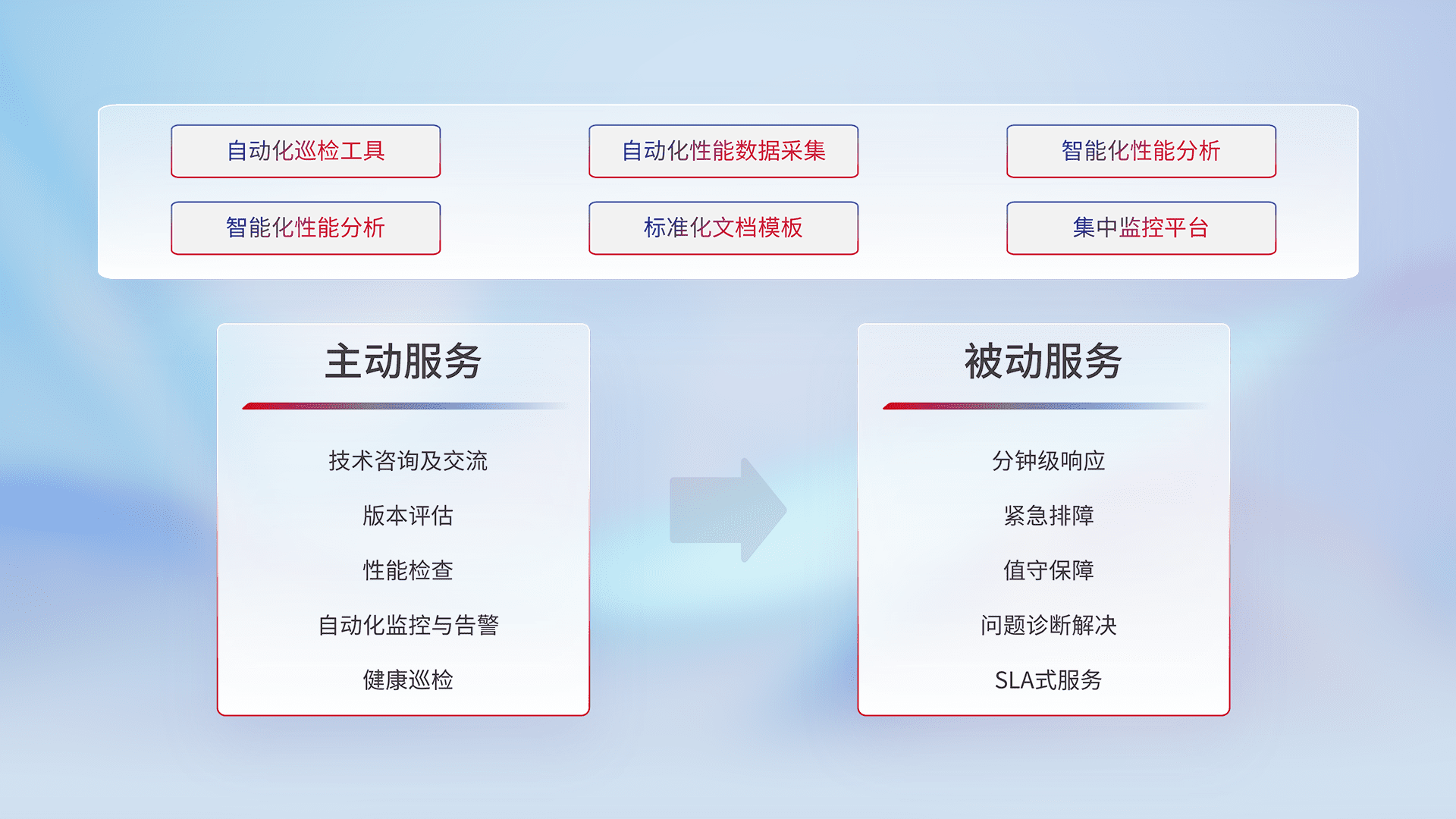 智能化工具和标准化文档,,保障服务质量,,,提供主动服务(包含技术咨询、、、、版本评估、、性能检查、、自动化监控与告警、、健康巡检)和被动服务包含(分钟级响应、、、紧急排障、、、、值守保障、、问题诊断解决、、、、SLA服务)。。。。