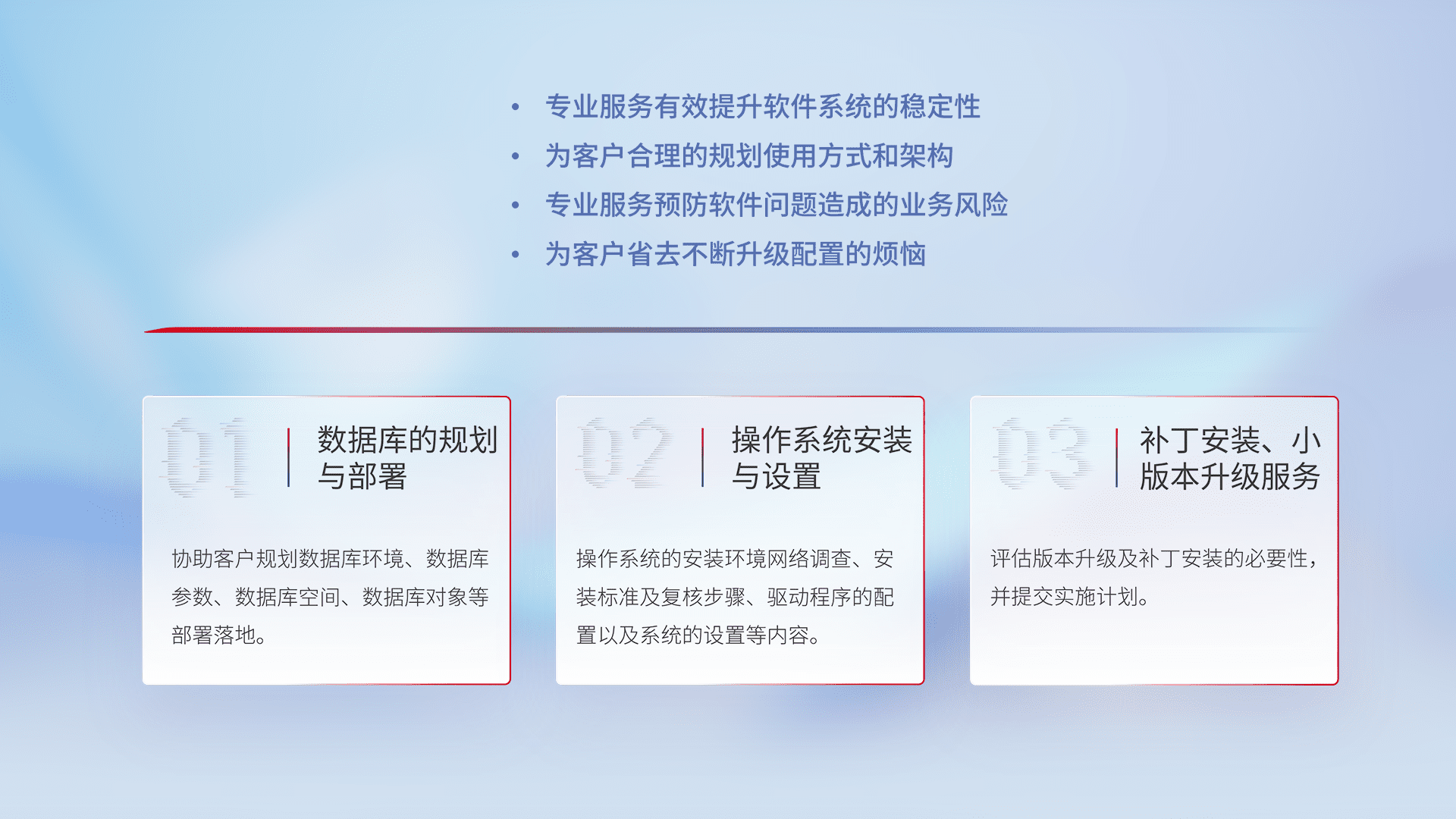 为客户提供软件规模升级、、、、快速部署、、、按需配置的专业服务,,从数据库的规划与部署到操作系统的安装与设置,,,,再到补丁安装和小版本升级提供支持。。